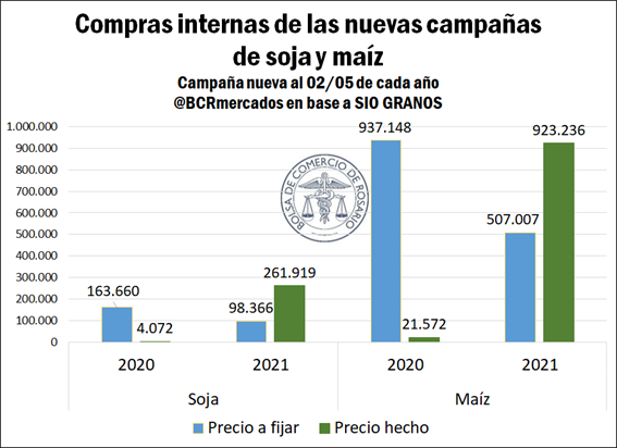 Por otro lado, el alza de precios también ha impulsado las compras por anticipado de soja y maíz correspondientes a la próxima campaña 2021/22 con volúmenes que duplican los totales del ciclo anterior en el caso de la soja (se anotaron 0,36 M). En maíz, la suba interanual alcanza el 50%, con contratos por 1,5 Mt con un fuerte incremento de negocios con precio hecho (64% del total a mayo 2021 contra apenas el 2% a mayo 2020).