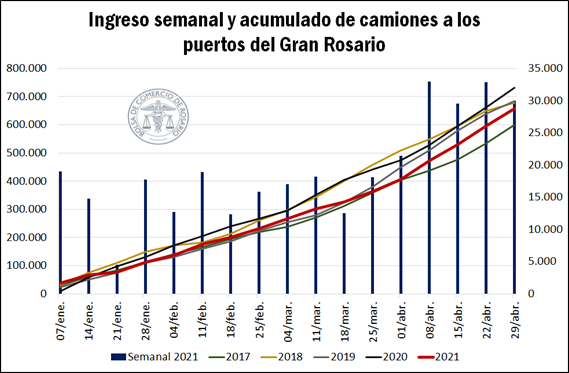 La menor disponibilidad de granos en el mercado local para esta altura del año se ve reflejado en el ingreso de camiones a los puertos del Gran Rosario. En base a datos de recibidores, se estima que desde enero a la fecha arribaron un total de 667.000 camiones a descargar granos (incluyendo soja, maíz, trigo, sorgo, girasol y cebada), un 14% menos que lo ocurrido a igual fecha del año anterior, y el menor número de camiones desde el año 2017.