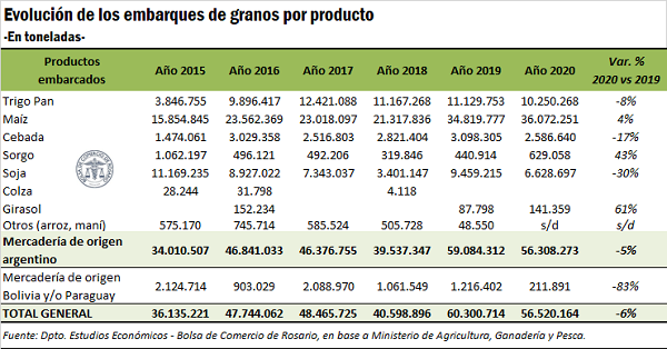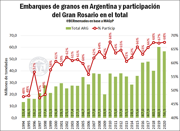 Así, de los más de 56,5 millones de toneladas de trigo, maíz, cebada, sorgo, soja y girasol que despachó Argentina en el 2020, el 68% del total partieron de las terminales radicadas en el Gran Rosario, en línea con los máximos históricos. Individualizando para cada producto, se tiene que del total de embarques del año 2020 el nodo del sur santafesino representó: