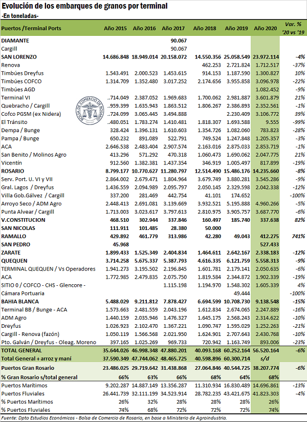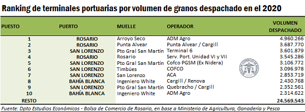 Si se toma cada terminal portuaria de modo individual, de las 10 que mayor volumen de granos despacharon en el año 2020, estas sumaron en conjunto embarques por 32 millones de toneladas, o un 57% del total nacional. De ellas, los 7 primeros puestos corresponden a plantas localizadas en el nodo Gran Rosario (y que embarcaron en conjunto 24,9 Mt) y de las 3 restantes, la que ocupa el puesto n° 9 se encuentra en Puerto General San Martín (Quebracho/Cargill) en tanto que la 8 y 10 son Cargil/Renova y ADM Agro, ambas citas en Bahía Blanca.