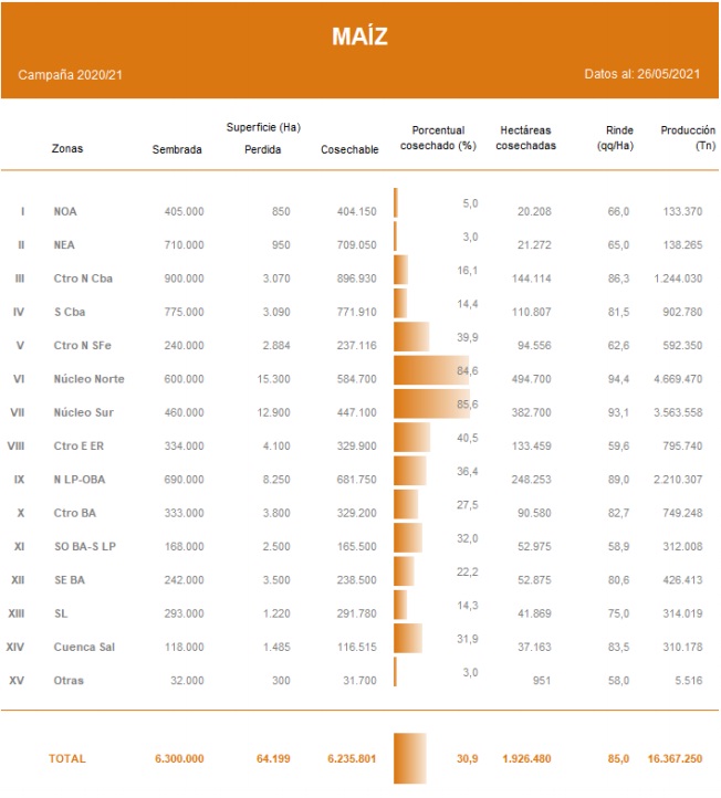 El avance de recolección nacional es del 30,9 % del área apta. La estimación de producción es de 46 MTn, 5,5 MTn menos que la campaña previa (Producción ciclo 2019/20: 51,5 MTn).