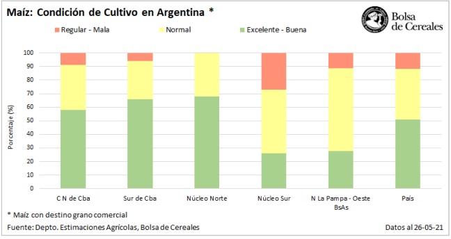 Se relevan muy buenos rendimientos en la provincia de Córdoba, aunque algunos lotes podrían tener mermas por el volcado de plantas. En las zonas Centro-Norte de Santa Fe y Centro-Este de Entre Ríos, la cosecha brinda rindes por debajo de las expectativas iniciales. Sobre los Núcleos Norte y Sur, culminó la recolección de cuadros tempranos. Hacia la provincia de San Luis, se mantienen las buenas expectativas de rinde de los planteos tardíos. En las zonas Oeste de Buenos Aires-Norte de La Pampa, Cuenca del Salado y el Centro de Buenos Aires, nuevas lluvias impiden que las labores se desarrollen con fluidez por falta de piso