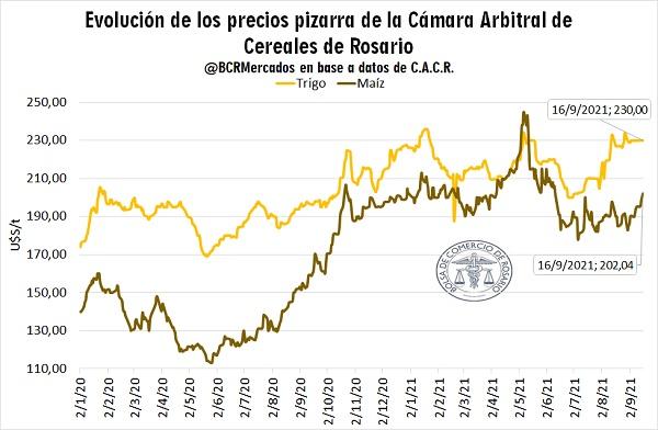 En cuanto a la evolución de los precios disponibles informados por la Cámara Arbitral de Cereales de Rosario (CACR), la tendencia de las cotizaciones fue alcista, en sintonía con las ofertas abiertas del mercado local. Entre los cereales, se destaca la suba del maíz, registrando un aumento en la última semana de U$S 6,7/t, lo cual indica un incremento del 3,4%.
