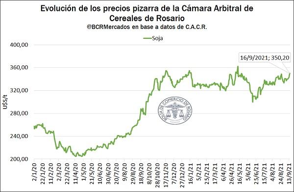 Por su parte, los valores de soja informados por la Cámara siguieron el mismo rumbo que el maíz. Desde el viernes pasado, el aumento en la cotización es de U$S 10/t, representando una suba del 2,9%. De esta forma, la oleaginosa se encuentra solo 3,3% por detrás del máximo registrado a mediados de mayo del presente año (US$ 362,03/t).