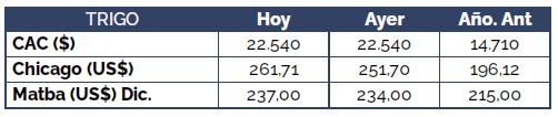 Por trigo, la entrega más próxima de las ofertas fue para octubre, la misma tuvo un valor de US$ 233/t, US$ 3/t por encima del martes.