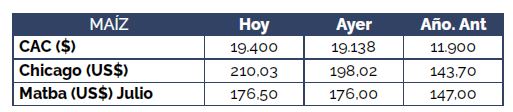Por maíz con entrega inmediata, la mejor oferta abierta se ubicó en US$ 200/t, resultando en un incremento de US$ 5/t. Este mismo valor fue ofrecido para las fijaciones de mercadería. Luego, para la entrega entre octubre y febrero del 2022, las ofertas se encontraron en US$ 205/t, implicando aumentos de US$ 8/t para octubre y US$ 5/t para el resto de los meses.