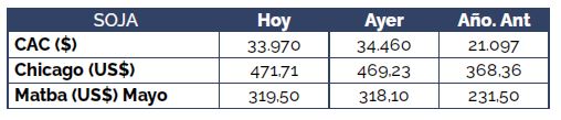 Por soja con entrega inmediata, contractual y para fijaciones, se ofrecieron sobre el final de la rueda de negocios US$ 345/t, mismo que el día de ayer. La oferta en pesos se situó en $ 34.000/t.