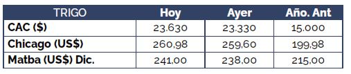 Por trigo con entrega disponible y contractual se ofrecieron US$ 237/t. US$ 2/t por encima de la oferta del día de ayer, sin descartar mejoras.