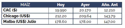 Por maíz con entrega inmediata, contractual y para fijaciones se ofrecieron US$ 205/t, cinco dólares por encima de ayer. Para la entrega en diciembre, la mejor oferta abierta alcanzó US$ 207/t, aunque no se descartan mejoras realizando ofrecimientos.