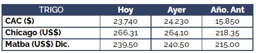 Por trigo con entrega disponible y contractual las ofertas se ubicaron en US$ 235/t, resultando en una caída de US$ 5/t respecto a lo registrado en la jornada de ayer.