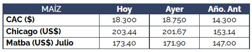 En cuanto al cereal de la nueva campaña, el segmento de negociación marzo/mayo se ubicó en US$ 180/t, sin variaciones respecto al miércoles. Luego, por maíz de cosecha tardía se ofrecieron US$ 175/t para la entrega en junio, superando en US$ 5/t las ofertas de ayer, mientras que julio se mantuvo en US$ 160/t y agosto en US$ 155/t.