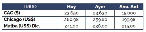 Por trigo con entrega disponible se ofrecieron US$ 240/t. US$ 3/t por encima de la oferta del día de ayer. Respecto al tramo octubre la oferta se ubicó en US$ 325/t, es decir, US$ 5/t menos que la rueda previa.