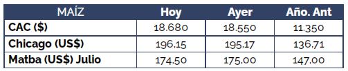 Por maíz con descarga inmediata se ofrecieron US$ 190/t, US$ 10/t por encima de la oferta abierta del día de ayer. Esta misma condición se ofrecía por el cereal con entrega contractual y septiembre. Las entregas más largas de la presente campaña no sufrieron mayores cambios.