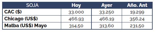 Por soja disponible, con entrega contractual y para fijaciones, se ofrecieron de forma abierta US$ 340/t, oferta generalizada entre las industrias. Esta oferta representa una mejora de US$ 5/t entre ruedas. Si el negocio quería realizarse en pesos, la oferta alcanzaba los $ 33.255/t.