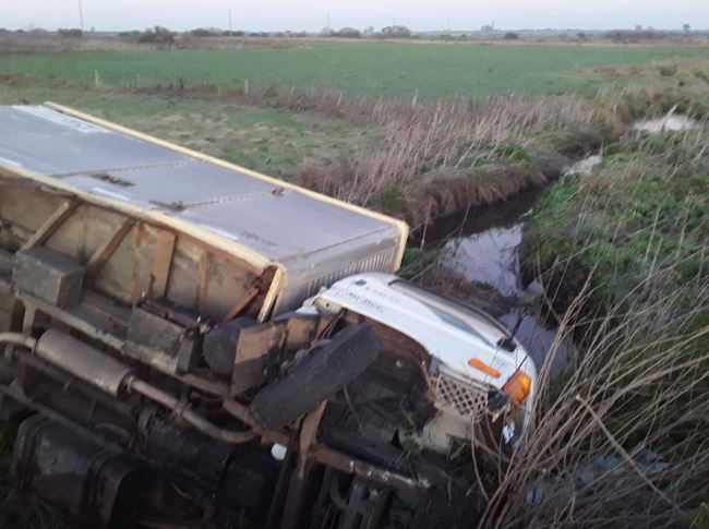 Un equino, poco antes del amanecer de este jueves 18 de agosto, pretendió cruzar la ruta y lo choca una camioneta, luego un camión, este último termina volcando. Afortunadamente las personas no sufrieron heridas de gravedad.