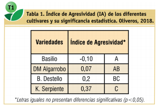 1.- Índice de Agresividad (IA) La habilidad competitiva de cada cultivar, medida a través del Índice de Agresividad (IA), se presenta en la Tabla 1.