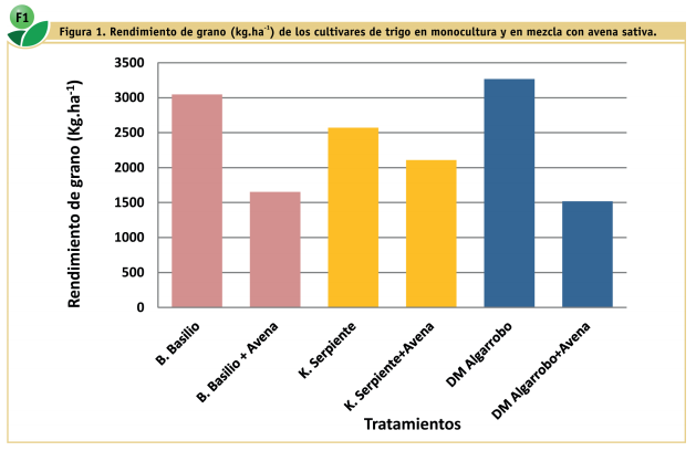 Con respecto a los valores de rendimientos relativos de granos (kg.ha-1) para los diferentes cultivares de trigo, se presentan en la Tabla 2. Con relación al rendimiento en grano, no se encontraron diferencias estadísticamente significativas entre los cultivares de trigo. El cultivar que obtuvo mejor rendimiento fue el DM Algarrobo. Sin embargo, en el RRC hubo diferencias significativas entre los cultivares evaluados. El cultivar Klein Serpiente presentó el valor más alto de RRC debido a que fue el cultivar que no presentó gran variación en el rendimiento cuando se lo sembró en mezcla con avena respecto a la monocultura (Figura 1). Esto es coincidente con los resultados obtenidos en la campaña 2017-18 (Castellarín, et al. 2018), donde dicho cultivar junto con el Baguette 680 fueron los de mayor RRC.