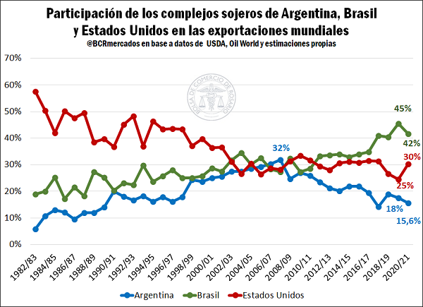 De 1990 hasta acá, la única vez que la participación del complejo sojero argentino en las exportaciones mundiales estuvo por debajo de esta marca fue en la campaña 2017/18, cuando una brutal sequía diezmó la producción nacional de soja que alcanzó apenas los 35 millones de toneladas. Este 16% es, además, la mitad del récord de 32% que supo conseguir nuestro país en la campaña 2007/08, cuando Argentina consiguió erigirse como principal abastecedor de poroto de soja y productos derivados al mundo.