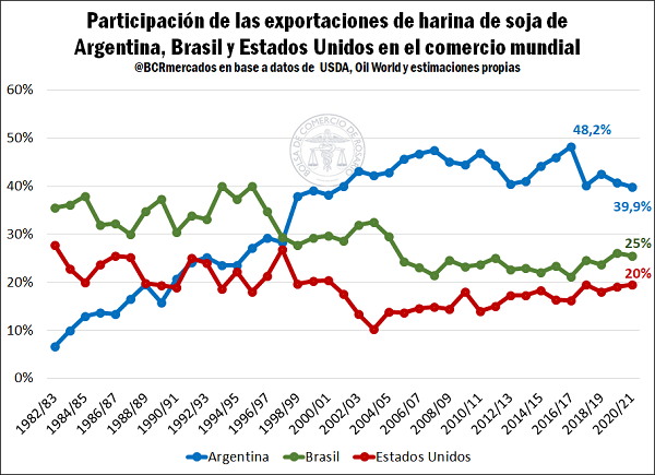 Si bien Argentina continúa siendo el principal abastecedor de harina de soja al mundo, con exportaciones estimadas para la nueva campaña en torno a los 26,5 millones de toneladas (muy por encima tanto de las 16,8 Mt que aportaría Brasil como de las 13 Mt estadounidenses), la participación relativa de nuestro país en el total mundial caería por debajo del 40% por primera vez desde la campaña 2000/01, hace exactamente 20 años atrás.