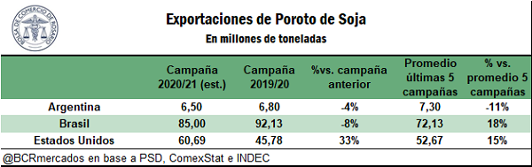 Brasil, en tanto, pese a que vería contraer sus exportaciones de poroto a 85 Mt en el año comercial 2020/21, 7 millones menos que la campaña anterior, aún sería el responsable de abastecer el 50% del mercado mundial de soja, levemente por debajo del 56% que consiguió en la campaña 2019/20.