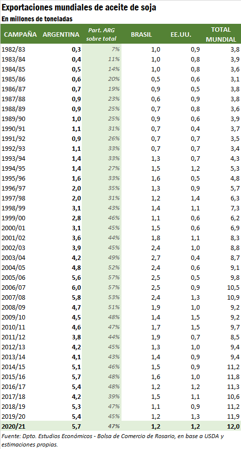 Las exportaciones proyectadas por encima de los 5,5 millones de toneladas de aceite de soja argentino se ubican de todos modos muy por encima tanto de los 1,15 Mt que embarcaría Brasil y de las 1,25 Mt de EE.UU. (en ambos casos, un 10% del total mundial).