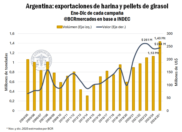 En contraste, la harina de girasol vive uno de sus mejores momentos históricos. Entre enero y octubre de 2025, Argentina exportó 1,26 millones de toneladas, el mayor volumen del siglo, superando en 28,6% al registro del mismo período de la campaña anterior.