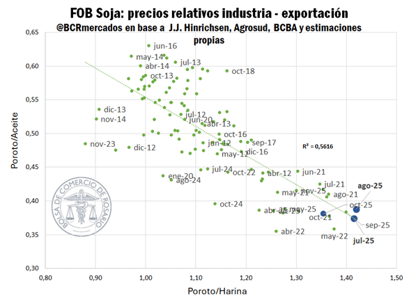 En el caso argentino, esta dinámica se refleja claramente en la relación inversa entre los precios del aceite y de la harina de soja. Mientras el aceite mantiene valores relativamente firmes por la demanda energética, la harina alcanza mínimos históricos en términos relativos, con una brecha que tocó pisos récord durante los meses de julio y agosto.