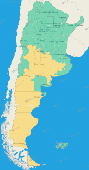 Buenos Aires: Costa de Bahía Blanca – Costa de Coronel Dorrego – Costa de Coronel de Marina Leonardo Rosales – Costa de Villarino – Monte Hermoso – Norte de Bahía Blanca – Oeste de Patagones – Oeste de Villarino – Puan – Zona baja de Coronel Pringles – Zona baja de Coronel Suárez – Zona baja de Saavedra – Zona baja de Tornquist – Adolfo Alsina – Daireaux – Guaminí – Pellegrini – Salliqueló – Trenque Lauquen – Tres Lomas – Florentino Ameghino – General Villegas – Rivadavia – Bolívar – Carlos Casares – Carlos Tejedor – Hipólito Yrigoyen – Pehuajó – General La Madrid – Laprida – Olavarría – Azul – Rauch – Tapalqué – Zona baja de Benito Juárez – Zona baja de Tandil –
