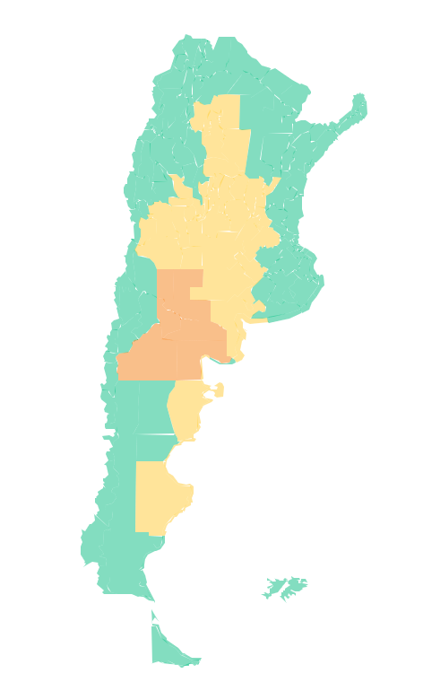 Tucumán: Burruyacú – Capital – Cruz Alta – Famaillá – Graneros – La Cocha – Leales – Simoca – Trancas – Yerba Buena – Zonas bajas de Chicligasta – Zonas bajas de Juan Bautista Alberdi – Zonas bajas de Lules – Zonas bajas de Monteros – Zonas bajas de Río Chico – Zonas bajas de Tafí Viejo