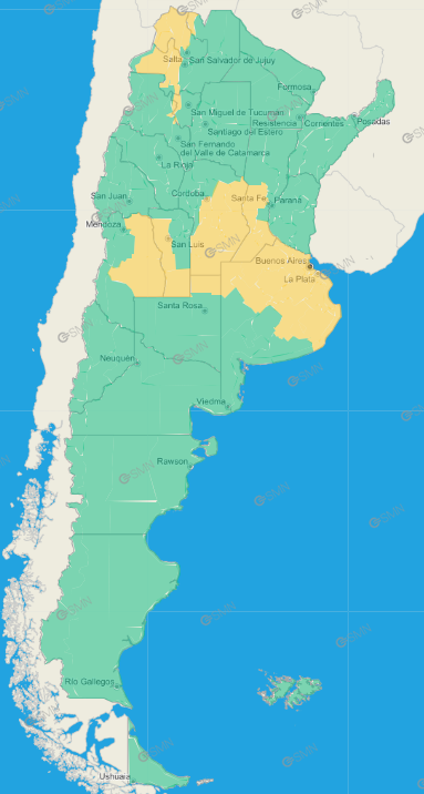 Buenos Aires: Costa de General Pueyrredón – Costa de Mar Chiquita – General Alvarado – Pinamar – Sudeste de General Juan Madariaga – Villa Gesell – Este de General Lavalle – La Costa – Azul – Rauch – Tapalqué – Zona baja de Benito Juárez – Zona baja de Tandil – Ayacucho – Balcarce – General Guido – Maipú – Noroeste de General Juan Madariaga – Noroeste de Mar Chiquita – Oeste de General Pueyrredón – Oeste de Castelli – Oeste de Chascomús – Oeste de Dolores – Oeste de General Lavalle – Oeste de Lezama – Oeste de Punta Indio – Oeste de Tordillo – Pila – Este de Castelli – Este de Chascomús – Este de Dolores – Este de Lezama – Este de Magdalena – Este de Punta Indio – Este de Tordillo – General Alvear – General Belgrano – General Paz – Las Flores – Lobos – Monte – Navarro – Roque Pérez – Saladillo – Berisso – Ensenada – La Plata – Almirante Brown – Avellaneda – Berazategui – Florencio Varela – Lanús – Lomas de Zamora – Presidente Perón – Quilmes – Esteban Echeverría – Ezeiza – La Matanza – Merlo – General Las Heras – General Rodríguez – Luján – Marcos Paz – Mercedes – San Andrés de Giles – Suipacha – Alberti – Bragado – Chivilcoy – General Viamonte – Nueve de Julio – Veinticinco de Mayo – Escobar – San Fernando – San Isidro – Tigre – Vicente López – Baradero – Ramallo – San Nicolás – San Pedro – Campana – Exaltación de la Cruz – San Antonio de Areco – Zárate – Arrecifes – Capitán Sarmiento – Carmen de Areco – Chacabuco – Colón – General Arenales – General Pinto – Junín – Leandro N. Alem – Lincoln – Pergamino – Rojas – Salto – Florentino Ameghino – General Villegas – Rivadavia – Alberti – Bragado – Chivilcoy – General Viamonte – Nueve de Julio – Veinticinco de Mayo – General Alvear – General Belgrano – General Paz – Las Flores – Lobos – Monte – Navarro – Roque Pérez – Saladillo –