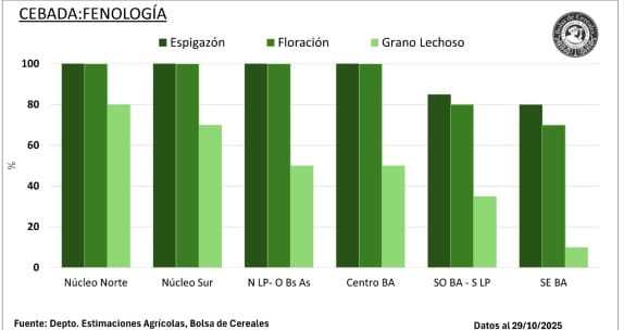 De acuerdo con el informe de la Bolsa de Cereales, estos episodios podrían afectar los componentes del rendimiento, ya que la cebada se encuentra transitando etapas fenológicas sensibles a las bajas temperaturas.