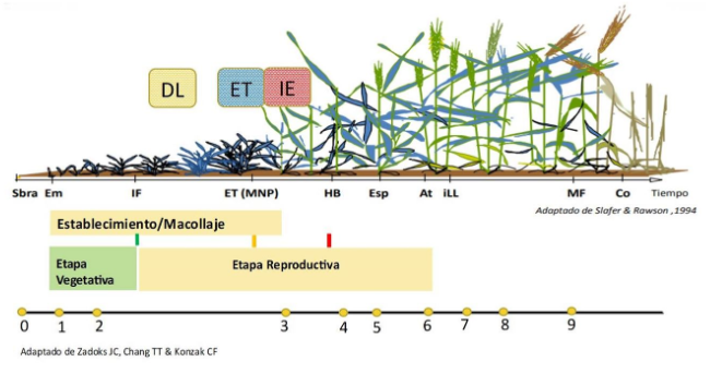 Referencias: DL(doble lomo)-ET(espiguilla terminal)-IE(inicio de encañado)-HB(hoja bandera).