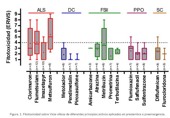 Los resultados (Fig. 1) muestran que la fitotoxicidad sobre vicia varía según los distintos grupos químicos, pero que en líneas generales, imazetapir, metolacloro, pendimetalin, piroxasulfone, amicarbazone, atrazina, prometrina, terbutilazina, flumioxazin, saflufenacil, sulfentrazone, diflufenican y flurocloridona, mostraron una selectividad aceptable para el cultivo.