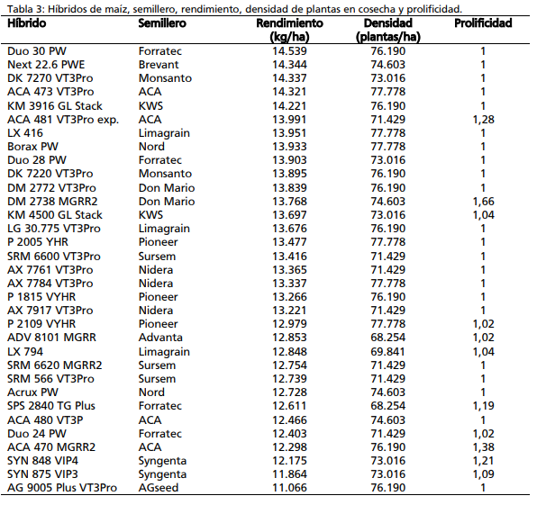 Todos los híbridos tuvieron una producción de grano superior a 11.000 kg/ha. Se observó una alta variabilidad de rendimiento entre algunos materiales, lo que muestra la necesidad de conocer el comportamiento en nuestra condición edafoclimática, y elegir criteriosamente el híbrido al momento de planificar el cultivo.