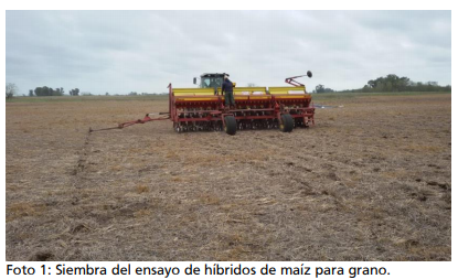El ensayo se realizó en el campo de la Escuela Inchausti, ubicado en la localidad de Valdés del partido de 25 de Mayo (35º 35’ 52,88” S – 60º 34’ 25,73” O). El cultivo antecesor fue soja de primera y el suelo hasta 20 cm de profundidad disponía de 2,2 % de materia orgánica, 12 mg/kg de fósforo extractable y un pH de 6. Previo a la siembra se aplicó 3 l/ha de glifosato 48 %, más 0,5 l/ha de 2,4 D 100 %, más 1 l/ha de atrazina 90 % y 0,5 l/ha de aceite antievaporante. El diseño del ensayo fue en parcelas apareadas de cinco surcos por 100 m de longitud en cada híbrido, con un testigo cada seis materiales para la corrección del rendimiento. La siembra fue en directa el 27 de septiembre (Foto 1), con una distancia entre surcos de 70 cm y fertilización en la línea con 100 kg/ha de una mezcla con 40 % de fósforo, 12 % de nitrógeno, 10 % de azufre y 1 % de zinc. En pos emergencia se aplicó 2,5 l/ha de glifosato 48 % más 1 l/ha de atrazina 90 % más 0,5 l/ha de aceite antievaporante. En estado fenológico de v5 se fertilizó con 200 kg/ha de urea (46-0-0) incorporada.