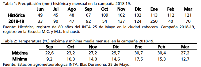 Se registraron las precipitaciones (Tabla 1) y las temperaturas máximas y mínimas medias mensuales (Tabla 2) durante el ciclo del cultivo.