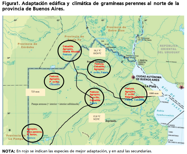 La conjunción del clima, relieve y suelo modelan las diferencias relativas en cuanto a la adaptación de las especies forrajeras en el norte de la provincia de Buenos Aires. En las Figuras 1 y 2 es posible observar como las variables bioclimáticas (lluvia y temperatura en este caso) determinan la distribución relativa de las especies forrajeras. Por ejemplo, la cebadilla criolla se ajusta mejor que otras en la región centro norte, el raigrás perenne en el este, la festuca alta en todo el centro, y el agropiro alargado en regiones con deficiencias hídricas.