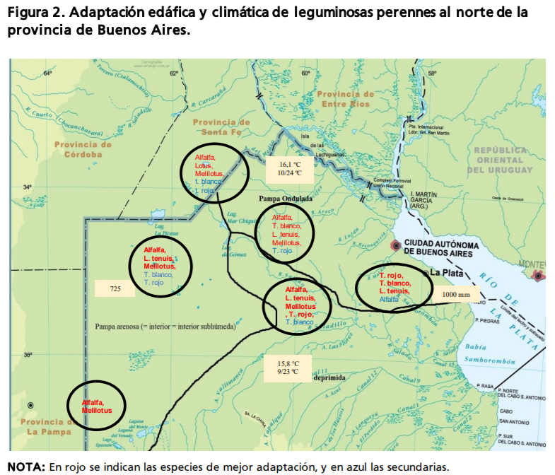 En el caso de las leguminosas, la alfalfa es de importancia central en los suelos agrícolas del centro y noroeste mientras el trébol rojo prospera mejor en el este de la región y el Lotus tenuis donde la presencia de humedad está garantizada.
