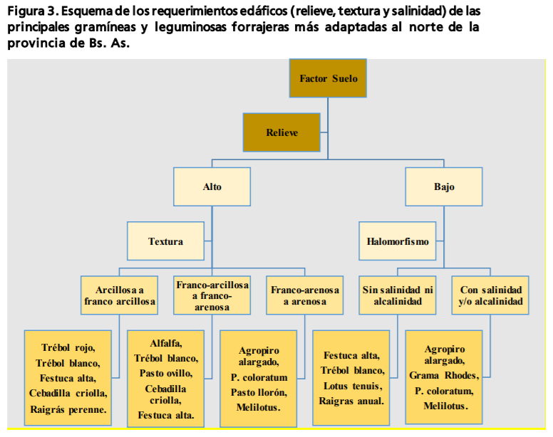 En estos últimos, a su vez, distinguir los hidromórficos (anegables sin sales) de los hidro-halomórficos (anegables con salinidad-alcalinidad). En el primer caso está claramente establecido que el reemplazo de especies nativas por pasturas base alfalfa determina un incremento significativo de la producción de forraje de calidad. En el caso de suelos ganaderos, previamente se debe establecer el valor forrajero de la vegetación natural (grupos de especies y su calidad) para analizar si es conveniente su reemplazo o implementar prácticas que favorezcan su presencia, producción y calidad. A continuación, se presenta un esquema con los requerimientos edáficos generales de las principales gramíneas y leguminosas forrajeras más adaptadas al norte de la provincia de Bs. As. (Figura 3).
