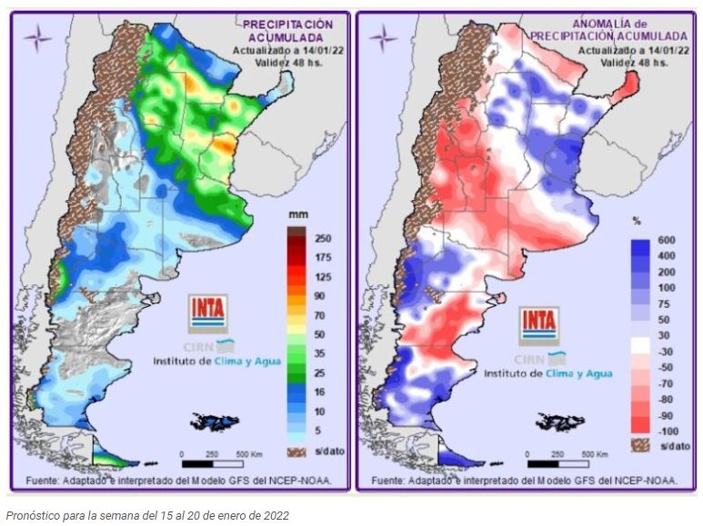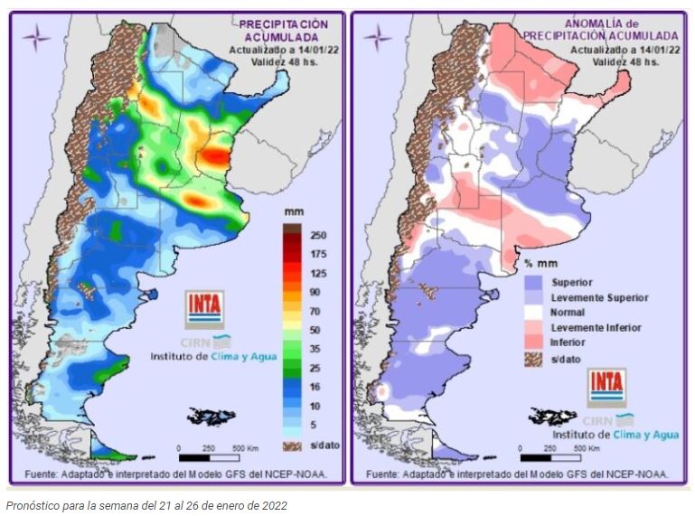 Por último, los especialistas indicaron que “si bien al día de la fecha existe incertidumbre con lo que pueda suceder hacia el final de este mes, el pronóstico indica mayor probabilidad de presentarse un periodo con precipitaciones de variada intensidad y generalizadas sobre el centro y norte del país”. De darse este pronóstico resultaría en un aporte hídrico a los cultivos durante lo que resta de este mes de enero.