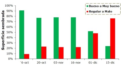 La combinación de heladas tardías, escasas precipitaciones y elevadas temperaturas generaron un escenario adverso para el cultivo de maíz de primera. Los factores mencionados causaron una importante caída en la condición del cereal, ocasionaron una reducción del 54 % en las categorías buena a muy buena, desde mediados del mes de noviembre a mediados de diciembre.
