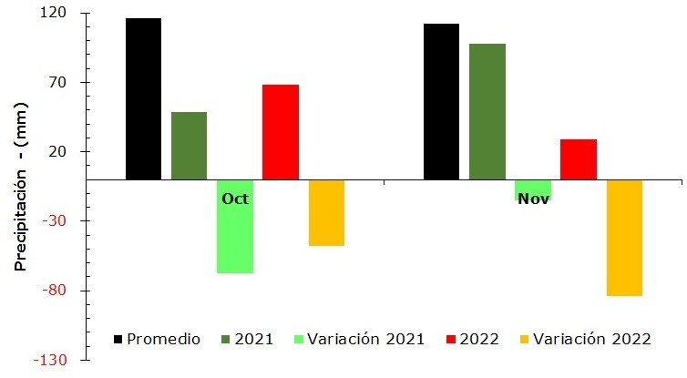 Al analizar las temperaturas máximas, el SIBER observa que en el año 2021, entre octubre y noviembre se registró un total de seis días con máximas superiores a los 35 oC, mientras que para el mismo periodo en el año 2022 el valor asciende a 19 días.
