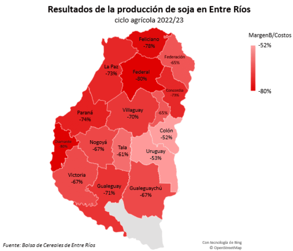 Otra consideración que se puede hacer es desagregar a nivel territorial, representando la zona centro y oeste de la provincia el 74% de estas pérdidas. Esto se debe a que tienen la mayor superficie sembrada de soja, cercana a las 710.000 hectáreas. En ninguno de los casos a nivel departamental, con los rendimientos por hectárea informados por el SIBER, se pudo dar un caso de beneficio bruto positivo.