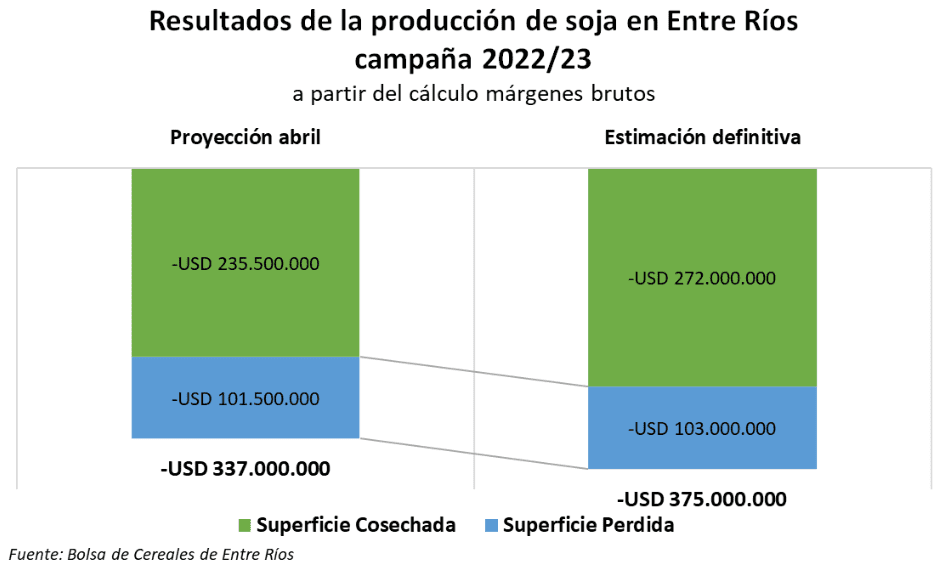 A modo de conclusión, si se desea estimar el impacto económico directo de la sequía en la producción de soja en Entre Ríos, se puede obtener por los ingresos que dejaron de percibir los productores en comparación con otra campaña, como puede ser la anterior, con una diferencia de casi U$S 900 millones, o a través de los márgenes negativos de la ecuación ingreso menos costo, que presenta pérdidas generalizadas teniendo en cuenta la superficie provincial por un total de U$S 375 millones.