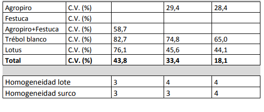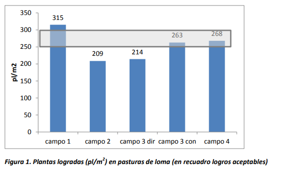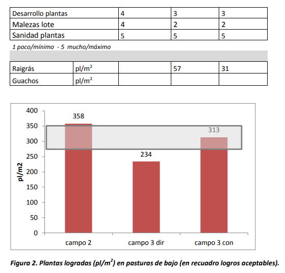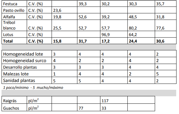 Para los cálculos se utilizó el PG (poder germinativo), P (pureza) y P1000 (peso de mil semillas) y los kilos efectivamente sembrados en cada uno de los lotes. Se hicieron en cada lote y al azar, 8 muestreos dobles de 1m de largo sobre la línea de siembra, es decir 16 muestras por lote. Allí se contaron plantas por separado de c/u de las especies sembradas (gramíneas con más de 3 hojas y leguminosas con al menos 1 hoja trifoliada expandida). Se observó también profundidad de siembra, homogeneidad del surco, desarrollo de las plantas, sanidad de las mismas, homogeneidad del lote y presencia de malezas. En el caso de lotes con alta infestación de raigrás anual y/o guachos del cultivo de invierno antecesor, se hizo un relevamiento de densidad de plantas.