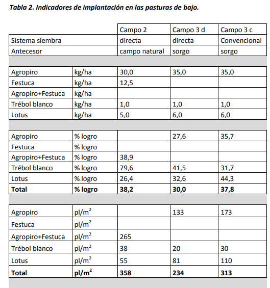 Los datos relevados y analizados de las pasturas de bajo se muestran a continuación en la Tabla 2.