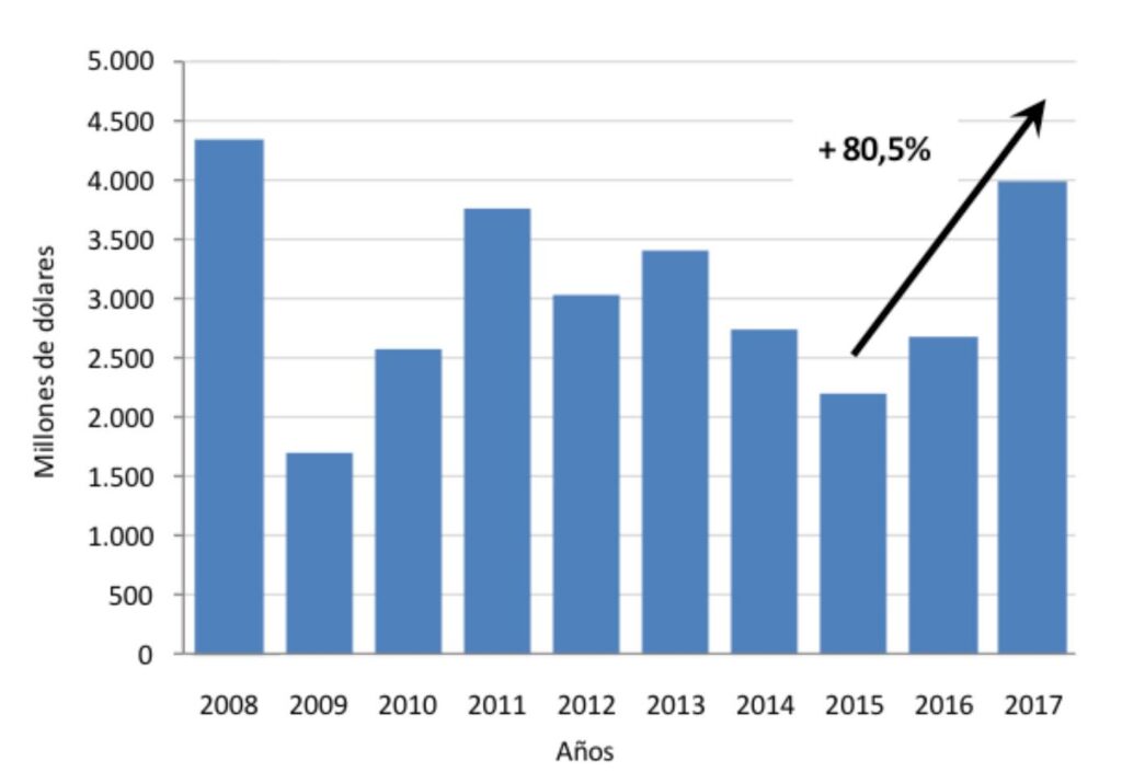 En el siguiente gráfico se observa la evolución de los montos importados en millones de dólares por todas las aduanas de la Provincia de Santa Fe para el período 2008 – 2017.