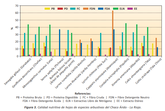 Más allá de los diversos aspectos beneficiosos que se pueden listar de las leñosas, y en particular de los arbustos, no se puede despreciar la calidad nutritiva de sus hojas y frutos en varias especies del Chaco Árido, que son clave en el balance forrajero y en la asignación de la carga caprina a una determinada área de ramoneo. En este sentido las revisiones bibliográficas locales sobre las especies nativas en cuanto a calidad nutritiva de sus hojas, reviste un aporte importante en la producción caprina, al determinar especies con potencial aprovechamiento bajo distintas estrategias de alimentación.
