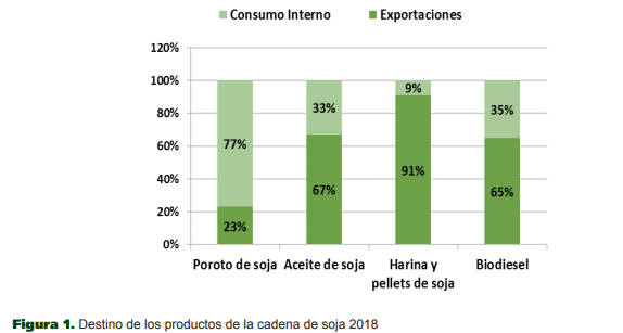 En Argentina, la cadena de soja reviste una importancia estratégica y se configura como una de las más competitivas en términos tecnológicos, productivos y de generación de divisas. Presenta un fuerte perfil exportador ya que el principal destino de los subproductos de la industrialización del grano, es el mercado externo. El 67% de la producción local del aceite se vuelca al mundo y en el caso de la harina la proporción es aún mayor, llegando al 91%. Argentina tiene la gran oportunidad de incrementar sustancialmente el valor de sus exportaciones mediante la industrialización integral de los granos.