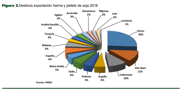 A partir de información primaria generada por organismos del estado y entes privados encargados de la comercialización de commodities y sus derivados, se analizaron series temporales de daImportancia de la Cadena de Soja en Argentina Ma.Cecilia Paolilli1 *, Silvina Ma. Cabrini1 , Leandro O. Pagliaricci1 , Francisco A. Fillat1 , Ma.Victoria Bitar2 En Argentina, la cadena de soja reviste una importancia estratégica y se configura como una de las más competitivas en términos tecnológicos, productivos y de generación de divisas. Presenta un fuerte perfil exportador ya que el principal destino de los subproductos de la industrialización del grano, es el mercado externo. El 67% de la producción local del aceite se vuelca al mundo y en el caso de la harina la proporción es aún mayor, llegando al 91%. Argentina tiene la gran oportunidad de incrementar sustancialmente el valor de sus exportaciones mediante la industrialización integral de los granos. El análisis fue realizado en base a los datos correspondientes al año 2018, en el cual se comercializó la mayor parte de la cosecha 2017/18.